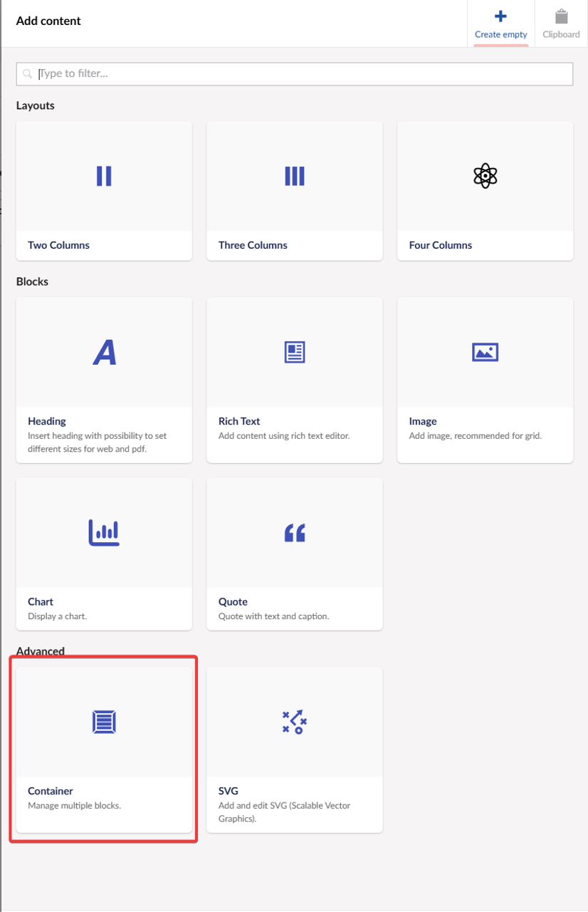 Container should be used in rare situations. It can help to achieve very complex layouts. It has no properties but it has area where you can insert same blocks as before.