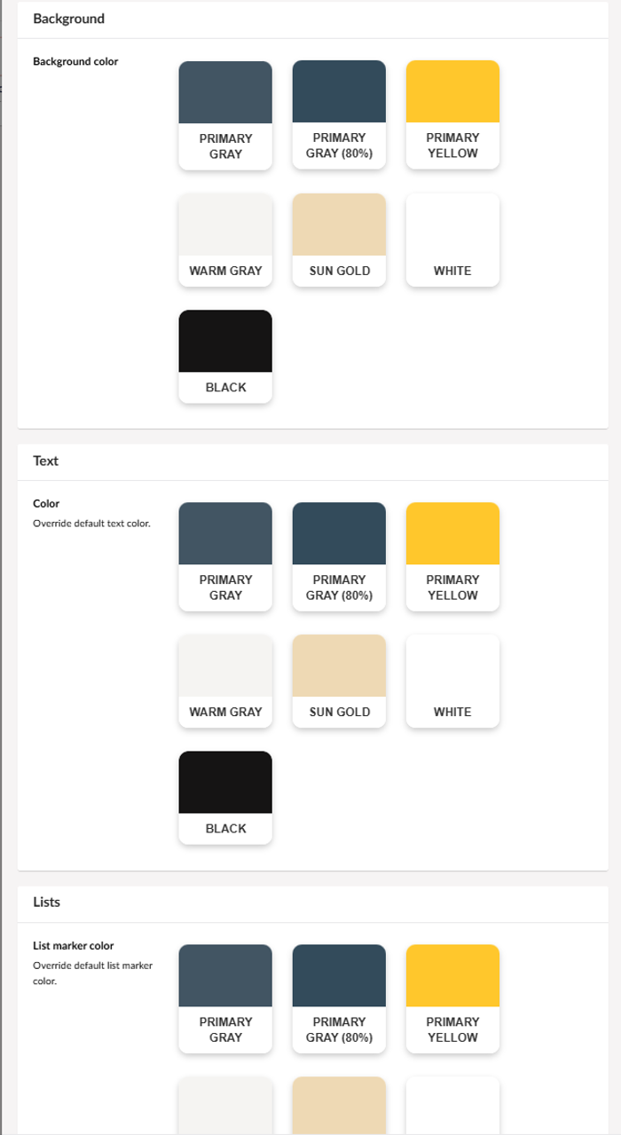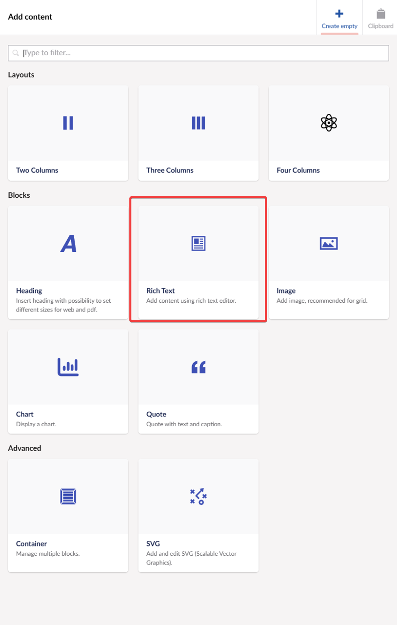 In the grid rich text block is used for general text, essentially it works same as in the editor.