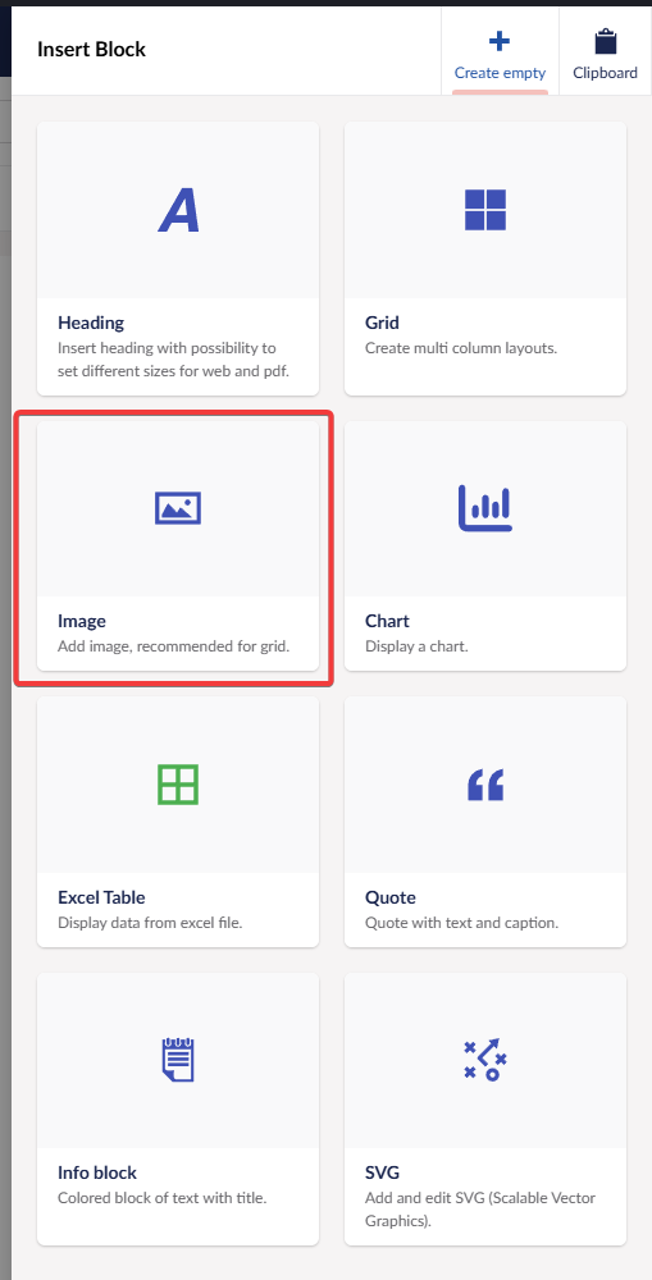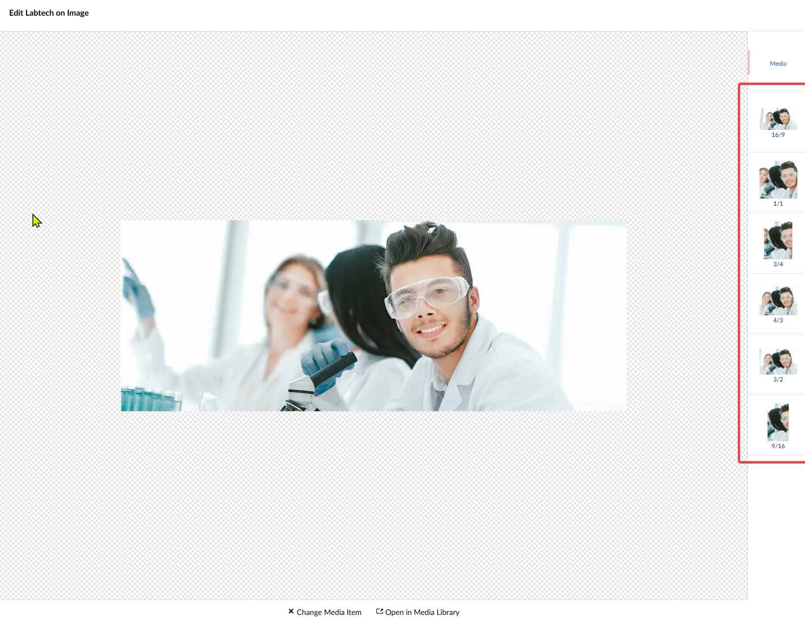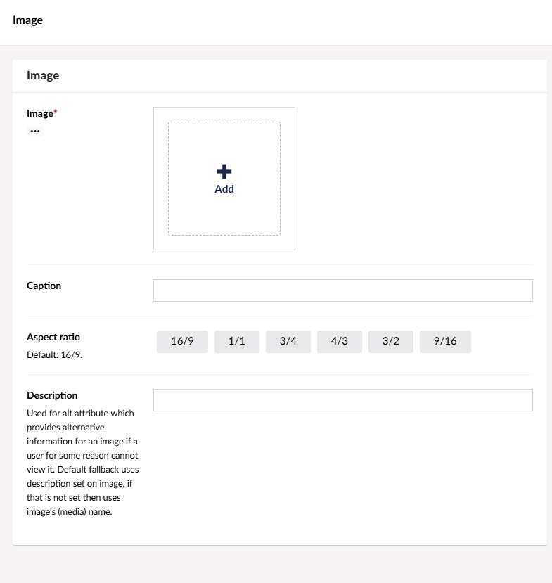 Select the image and the aspect ratio, by default aspect ratio is 16/9 (landscape). You can also set caption, that appears under the image as visible descriptive text. And description property is used for describing image in case image is not viewable for any reason.