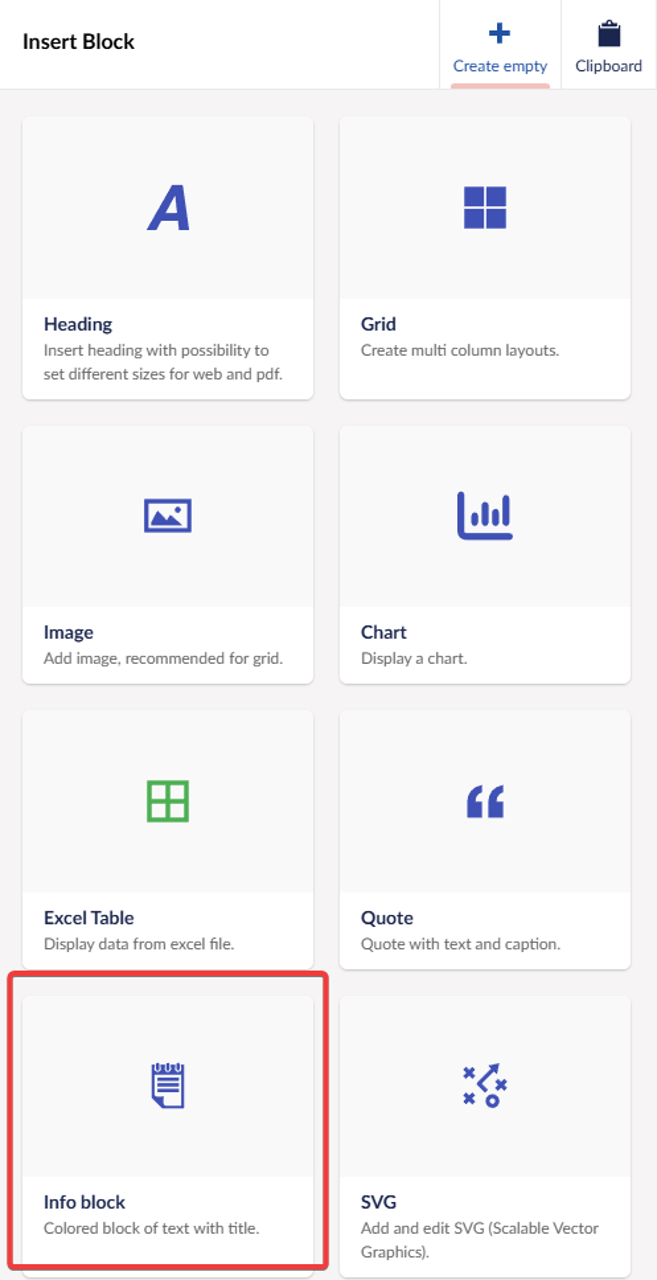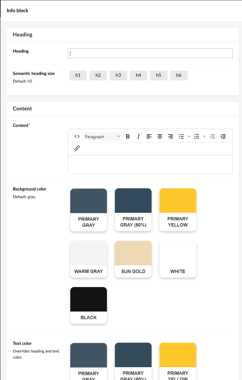 Optional heading with possibility to choose semantic heading size. Mandatory content property - the main text, you can use some simple rich text editor styling (bullet list for example). And optional background and text color settings, when you set background color always make sure that text color is good match for readibility.