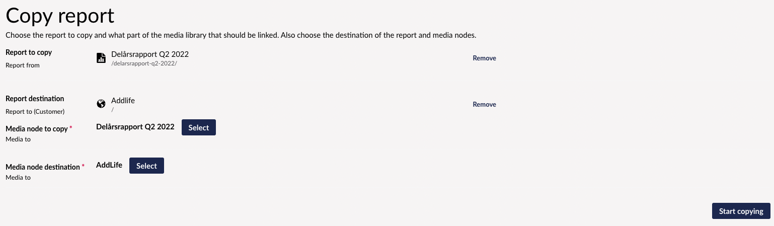 - Sedan ska Medianod kopieras. Välj samma nod som rapporten heter Delårsrapport Q2 2022.