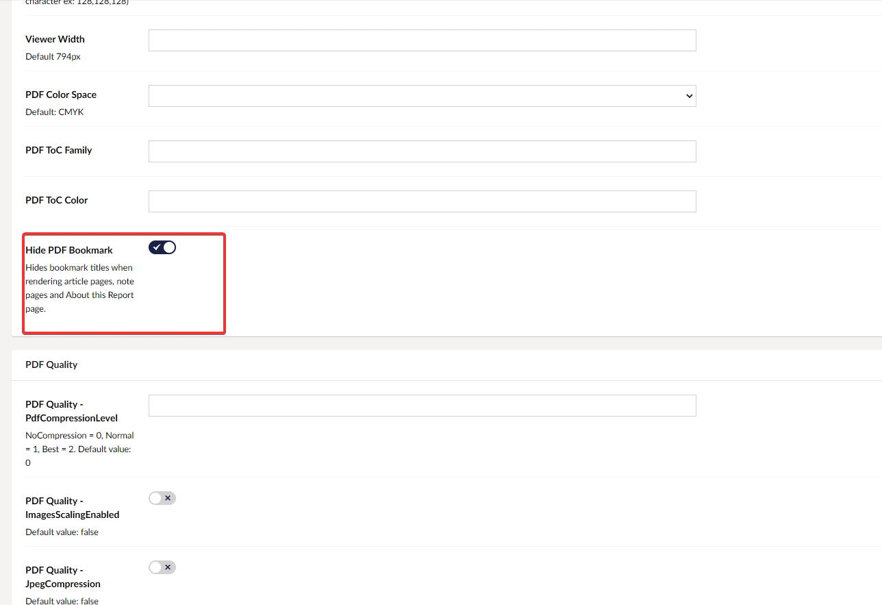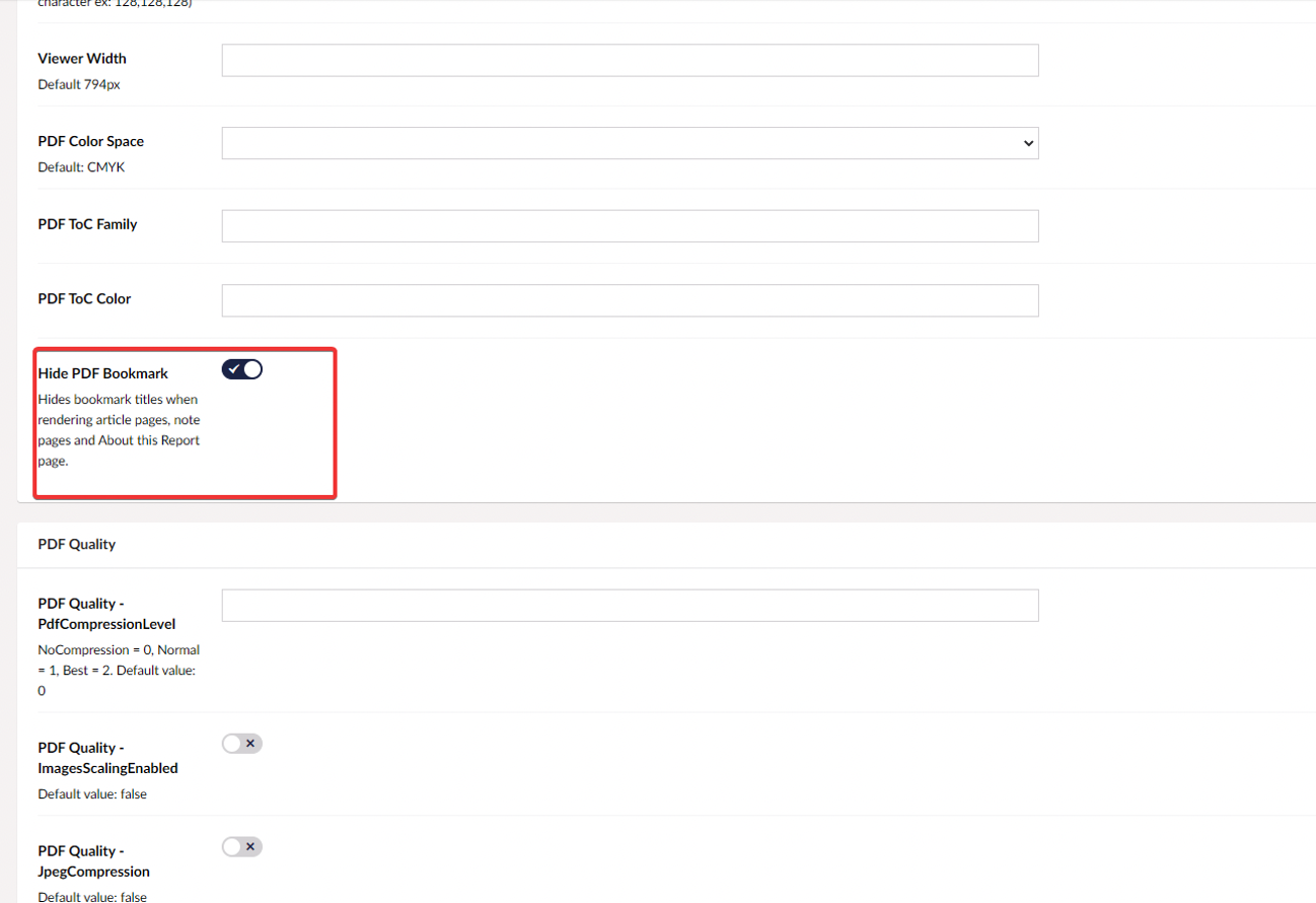 För att dölja sidhuvud i PDF så behöver man navigera till rapportnivån. Hide PDF bookmark ska aktiveras så att det döljs.
