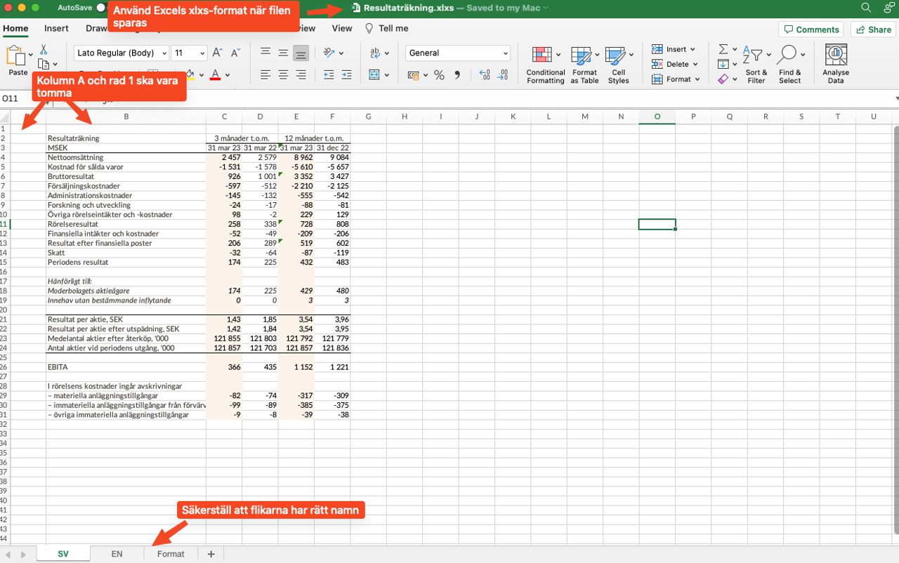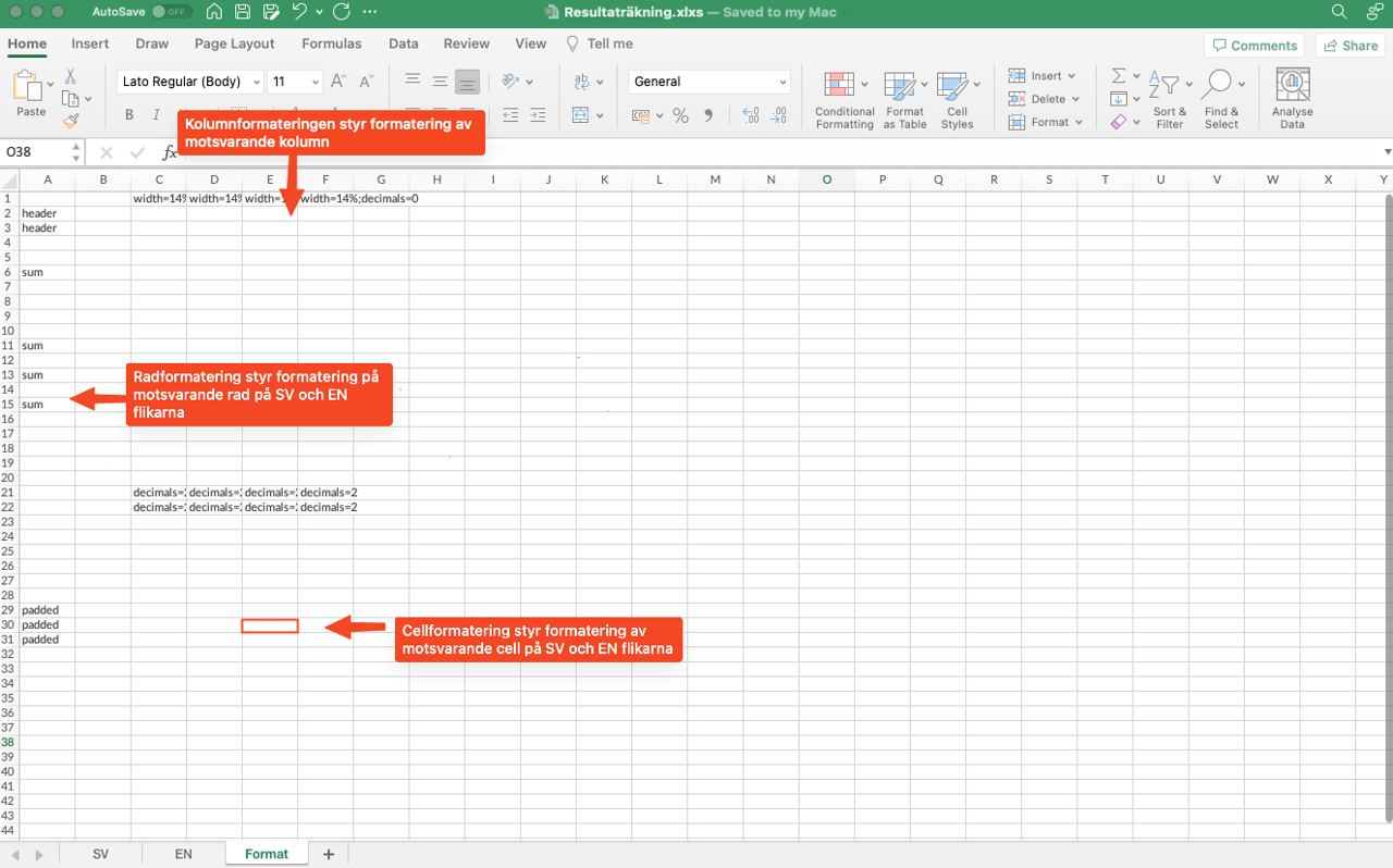- "EN" - För den engelska fliken importeras innehållet från varje cell i motsvarande cell i den svenska fliken. Om en engelsk cell, t.ex. B4, är tom kommer innehållet att hämtas från den svenska fliken. På så sätt behöver du bara fylla i och ändra siffror i den svenska fliken. Siffror läses automatiskt in med engelskt format på webbsidan. Observera att du behöver ha samma namn för flikarna "SV", "EN" och "Format".