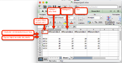 Excelfil som ska vara underlag till en graf med axlar (stapelgraf med en eller två axlar, linjegraf eller areagraf) ska ha följande format: