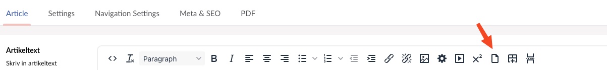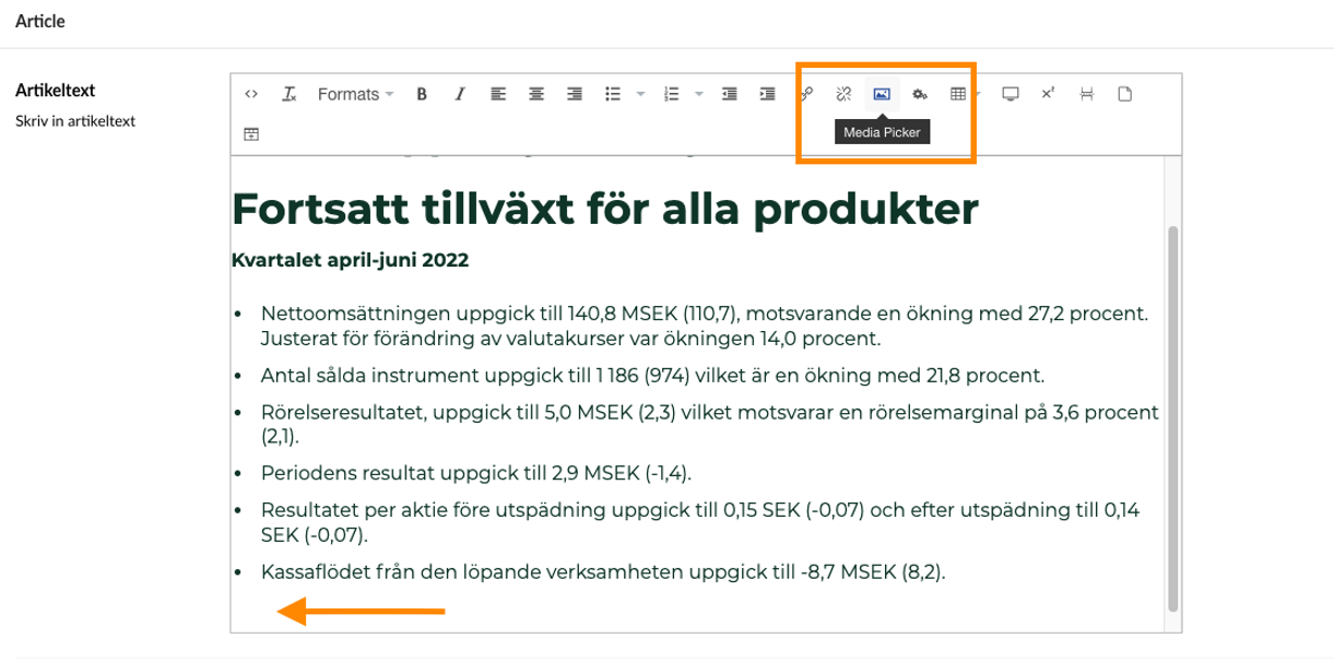 Du kan infoga bilder direkt i textfältet i Umbraco. Innan du lägger till en bild, se till att den redan är uppladdad i mediebiblioteket (se avsnittet "Mediebibliotek").