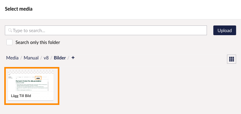 - Välj rätt mapp i mediebiblioteket och klicka på uppladdningsknappen. Välj sedan bilden i mediebiblioteket för att infoga den i texten.