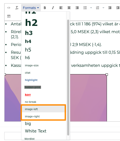 Om du vill justera bilden till höger eller vänster, markera bilden i content och välj lämpligt format som "Bild höger" eller "Bild vänster". Detta kan användas till exempel för VD-bilder.