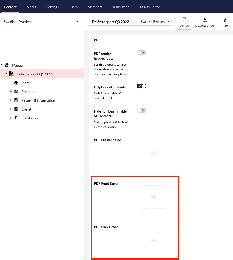 2. Scrolla därefter ner till avsnittet som heter ”PDF”. Där laddar du upp din tänkta fram- och baksida. Notera att skilja på engelsk och svensk version om ni har valt att ha er årsredovisning på båda språken.