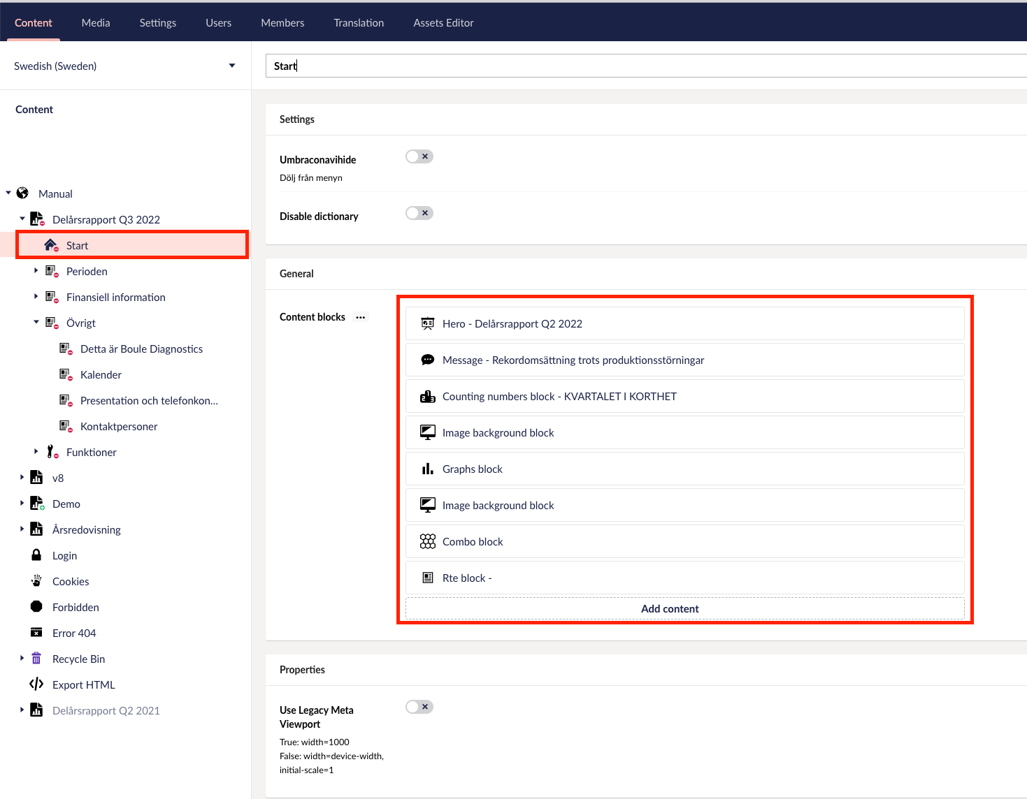 2. Startsidan är uppbyggd av olika block som fungerar som legobitar. Tryck på en av dessa för att redigera dem.