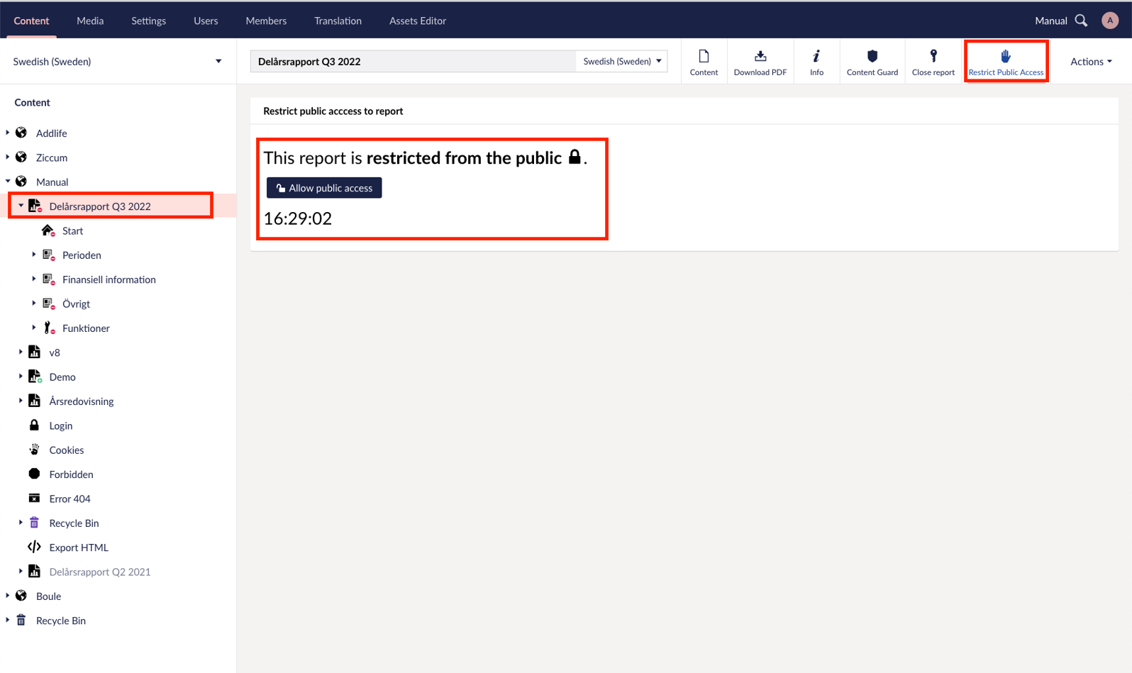 - Här ser du klockslag och knapp för att göra rapporten tillgänglig för allmänheten. Observera att aldrig släppa rapporten innan pressmeddelande har gått ut.